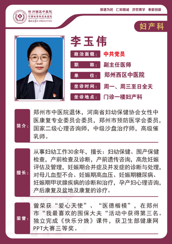 郑州市中医院退休,河南省妇幼保健协会女性中医康复专业委员会委员,郑州市预防医学会委员国家二级心理咨询师,中级沙盘治疗师,高级催乳师。